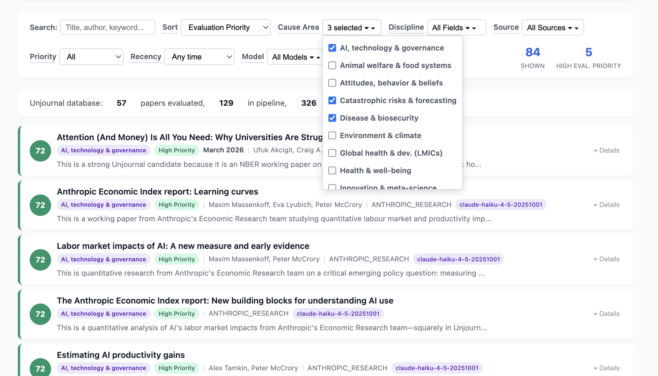 Scores reflect evaluation priority (expected value of commissioning an independent review), not research quality. ATM (IIRC) the AI only sees paper metadata and abstracts, not full texts. There's also a statistics page showing the breakdown by source, cause area, and score distribution.
